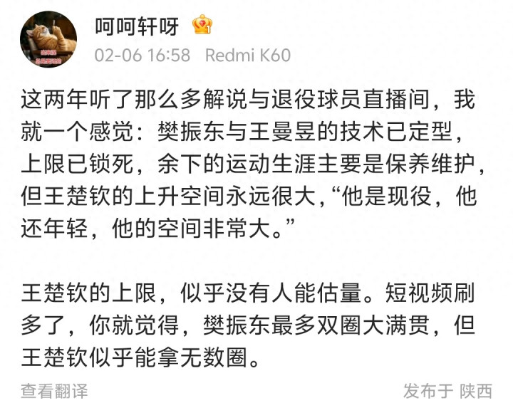 体坛记者贺晓龙专门发文,提到了现在很多解说员和退役球员在直播的时候认为王楚钦潜力大,樊振东和王曼昱技术已经定型,没有太多上限了。他们一致的看法就是王楚钦很年轻,空间很大。王楚钦确实是目前国乒男队绝对的主力,过去一年经常一个人打进决赛,对战外协选手冲击冠军。