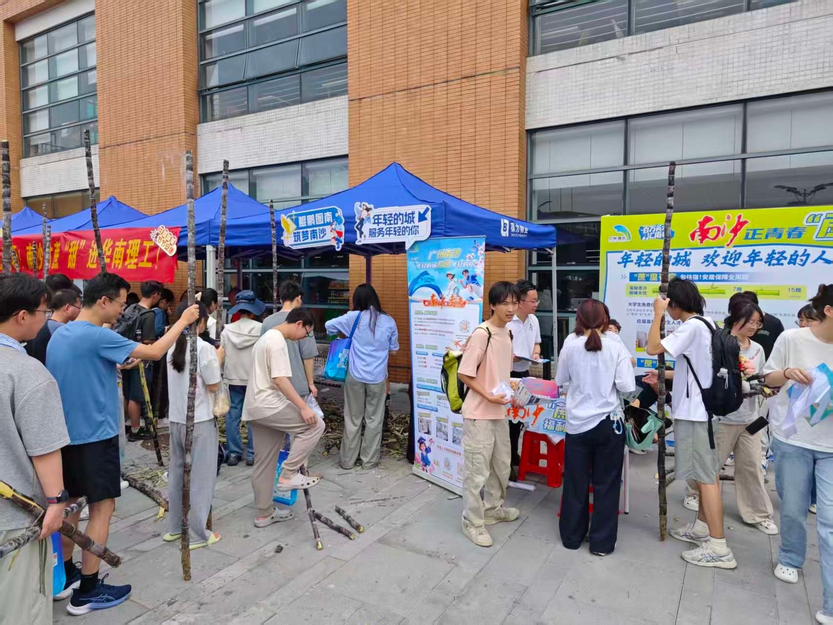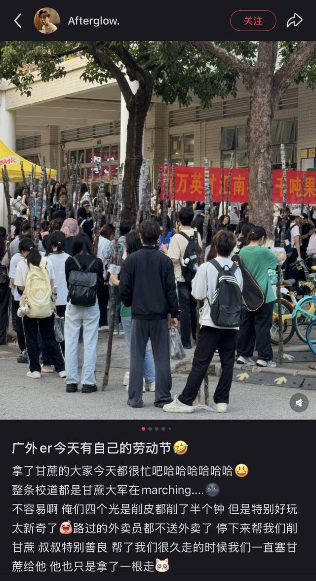 华南理工大学、华南农业大学、华南师范大学、暨南大学、广东外语外贸大学、广州大学、仲恺农业工程学院等高校宿舍楼下饭堂门口,南方医科大学珠江医院的大厅里,成捆成车的南沙果蔗整齐码放,同学们手脚麻利地卸货、分装、搬运,吆喝声、欢笑声此起彼伏,场面堪比年货大采购。