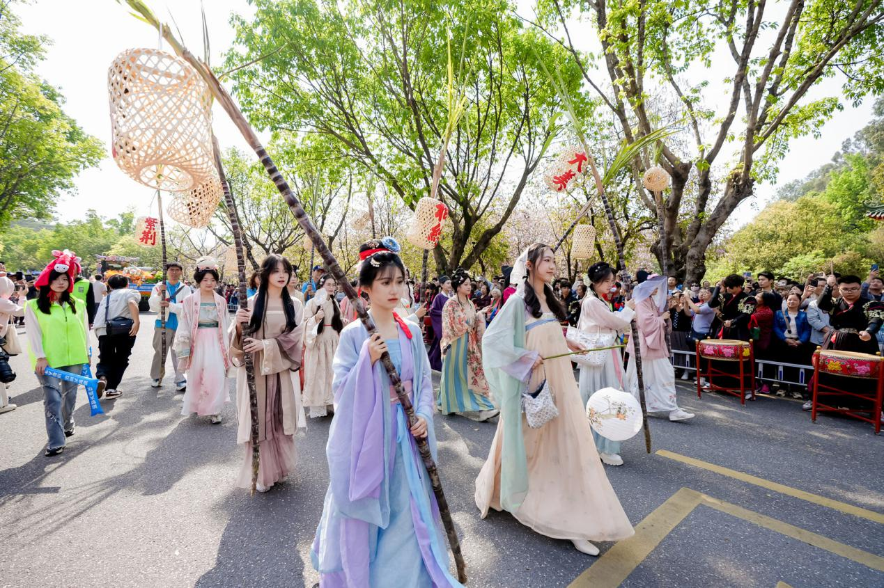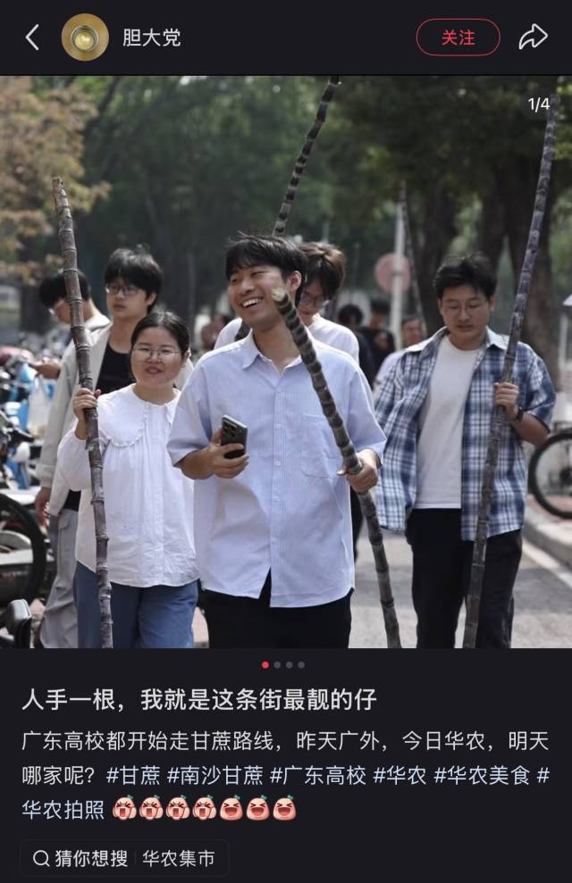 华南农业大学近日举办紫荆科技文化节,学生们身穿汉服,手执南沙黑皮果蔗,并在蔗头上挂竹笼,寓意“揸住碌竹、掂过碌蔗”。